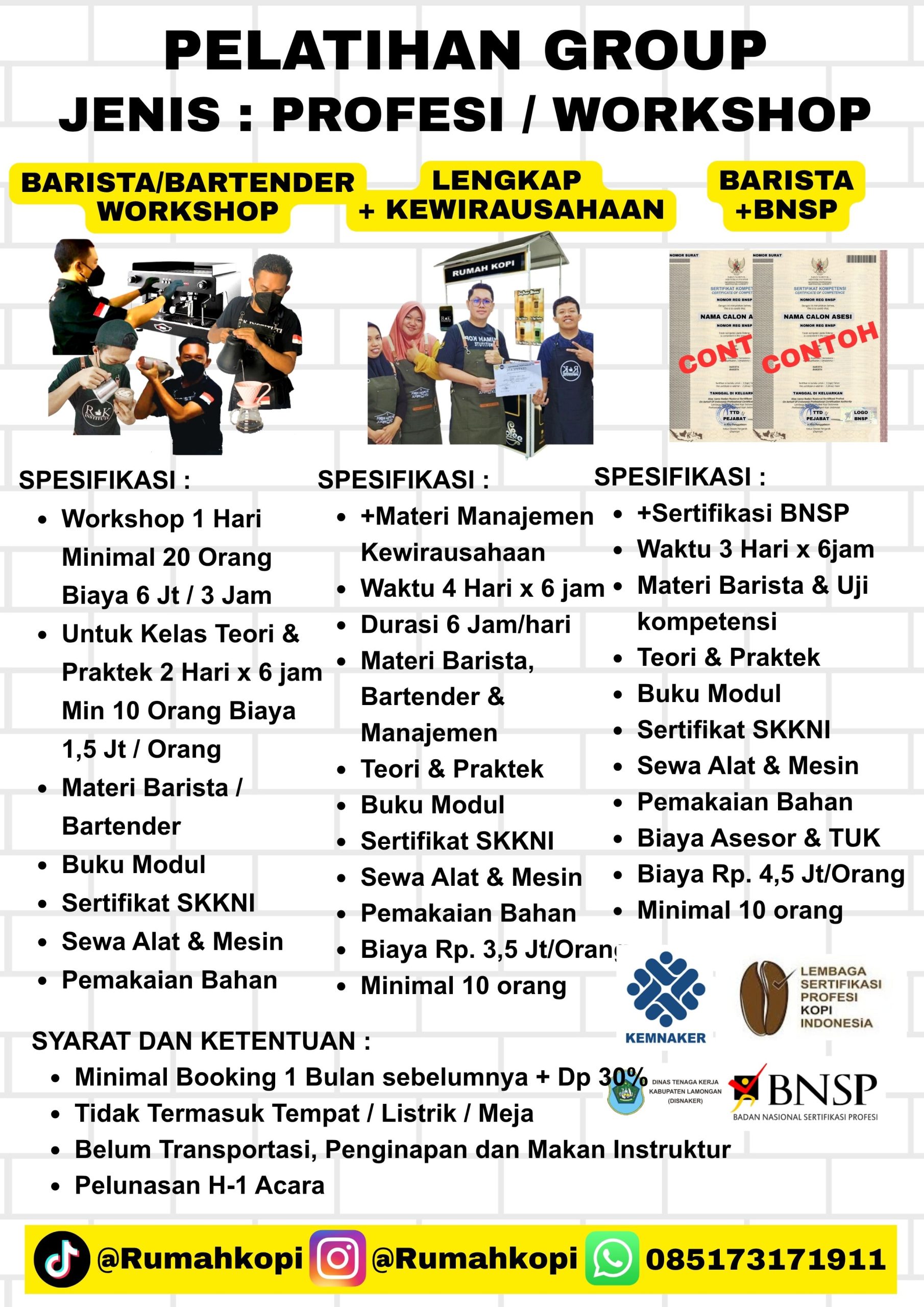 BARISTA/BARTENDER, LENGKAP + KEWIRAUSAHAAN, BARISTA + BNSP, WORKSHOP BARISTA, TOUR KEBUN KOPI & COFFEE SHOP, PENDAMPINGAN 6 BULAN